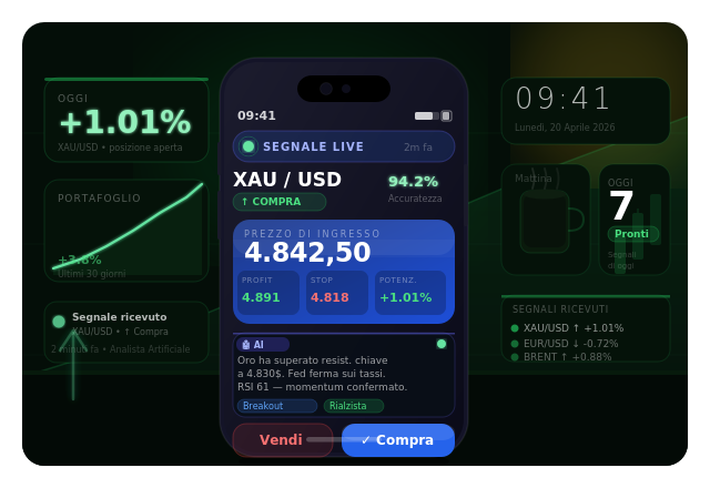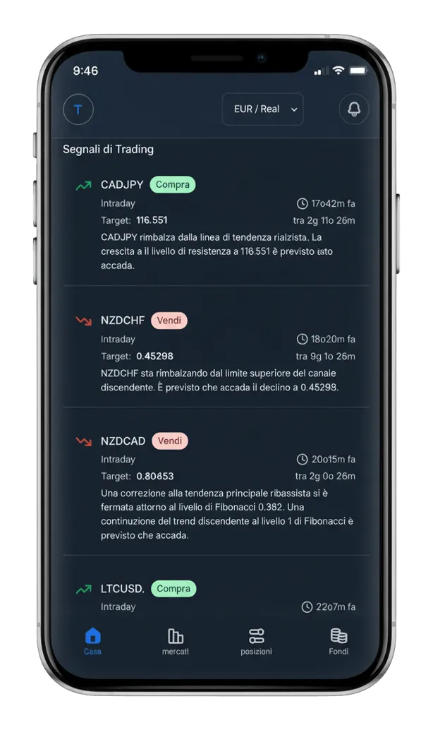 Ogni mattina trovi già pronti dai 5 ai 10 segnali analizzati dall'AI, con direzione e motivazione.
